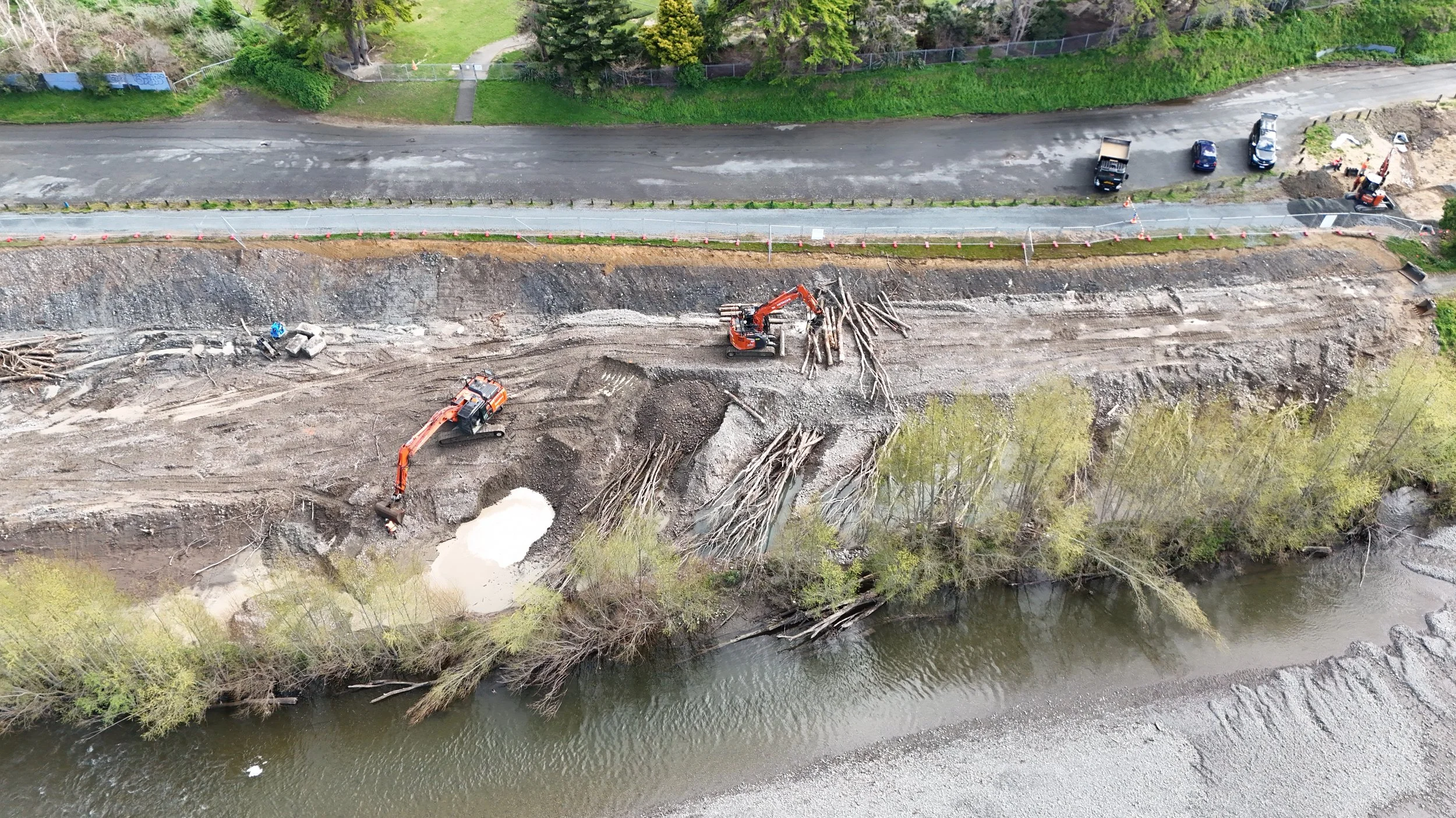 This forward-thinking approach - known as Bio-Engineering - repurposes mature willow trees into bundled tree groynes that are anchored into the river berms to provide natural erosion protection. These groynes not only deliver immediate resilience against strong river flows, but also regenerate, re-root and strengthen the riverbanks over time. To further stabilise the berms, we plant willow poles across the remaining areas, creating a living, self-reinforcing system.